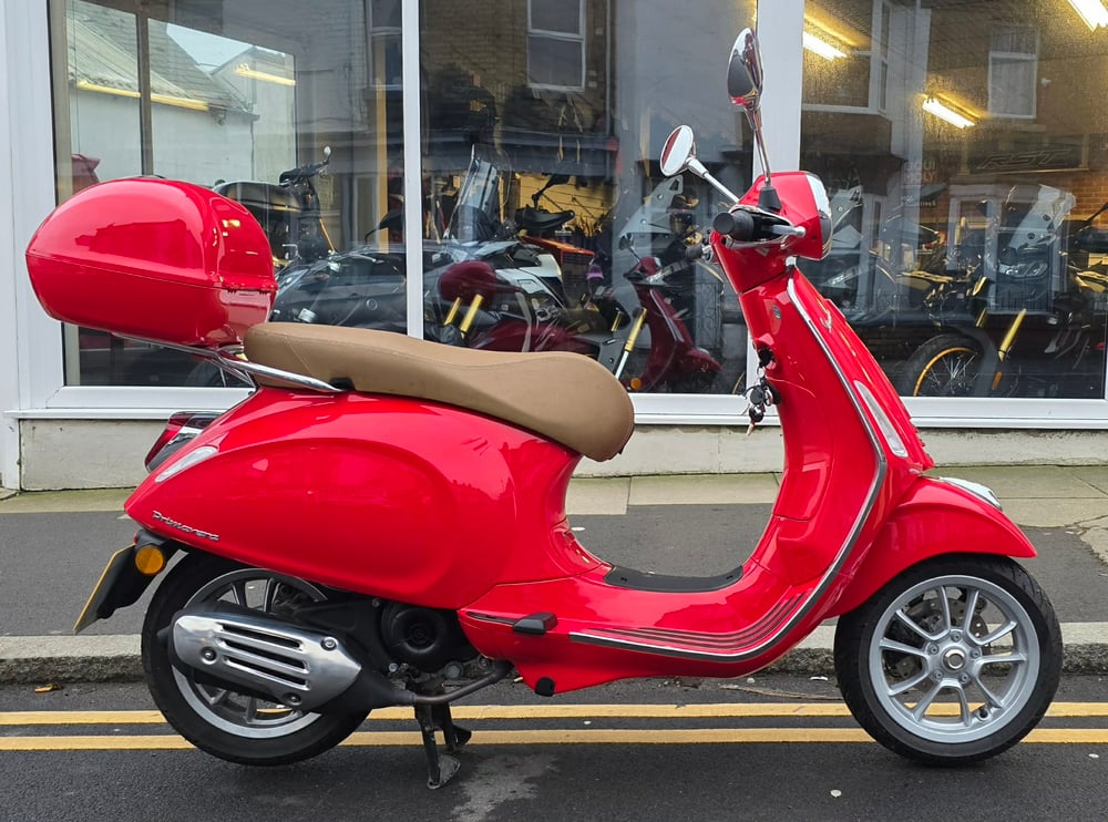 This stunning Vespa is a truly lovely, ultra low-mileage scooter with just 382 miles from new. Finished in a gorgeous, classic red with a colour-coded top box and contrasting tan seat, this Vespa presents beautifully and is in lovely condition throughout.